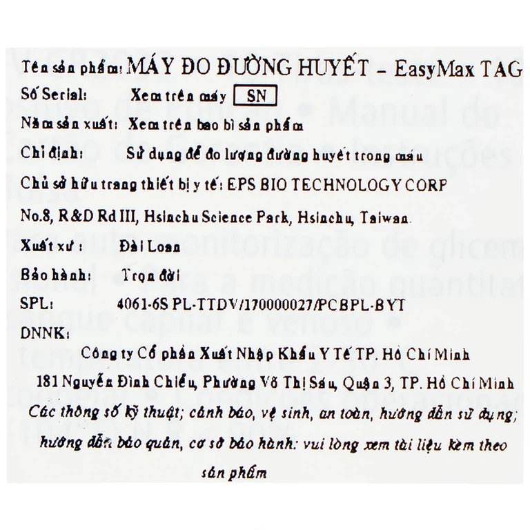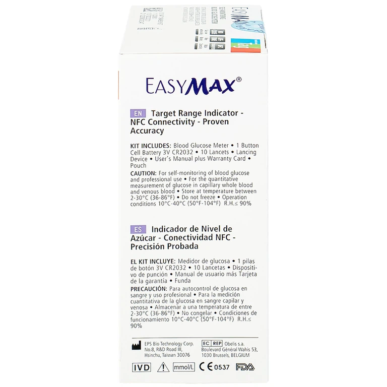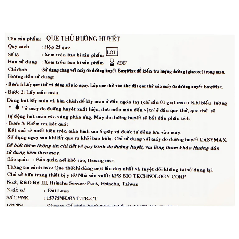 Combo 3 hộp que thử đường huyết Easy Max được sản xuất bởi EPS Bio Technology Corp. EPS Bio chuyên phát triển các sản phẩm cải tiến giúp cho việc xét nghiệm đường huyết trở nên dễ dàng và chính xác hơn. Thông qua chương trình phát triển sản phẩm sáng tạo, EPS Bio đã phát triển nhiều công nghệ theo dõi lượng glucose tiên tiến. Các hệ thống và ứng dụng dành cho thiết bị di động cũng cung cấp nhiều tính năng để đáp ứng các nhu cầu cụ thể của những người mắc bệnh tiểu đường.