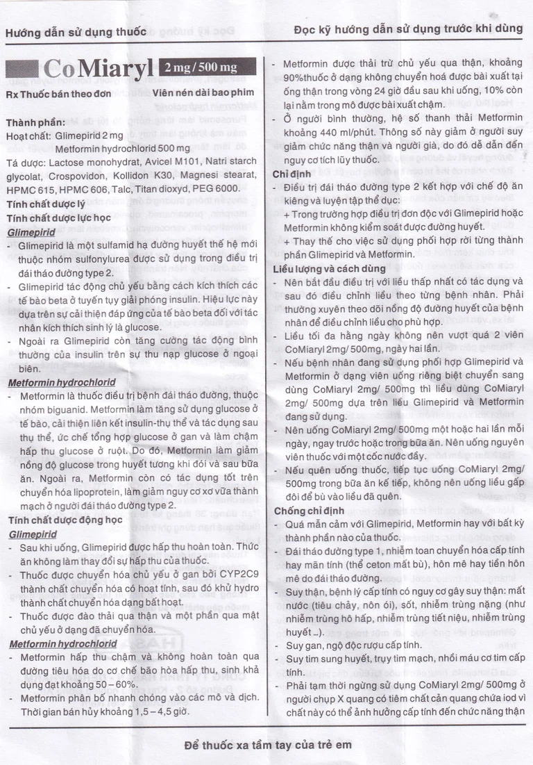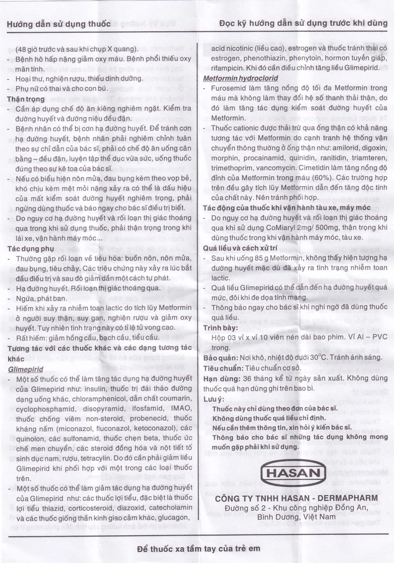 CoMiaryl là một sản phẩm của Công ty TNHH Hasan – Dermapharm với thành phần chính là glimepirid 2 mg và metformin hydrochlorid 500 mg. Thuốc được dùng trong điều trị đái tháo đường type 2 kết hợp với chế độ ăn kiêng và luyện tập thể dục. CoMiaryl được bào chế dạng viên nén dài bao phim và được đóng gói theo quy cách: hộp 3 vỉ x 10 viên nén.