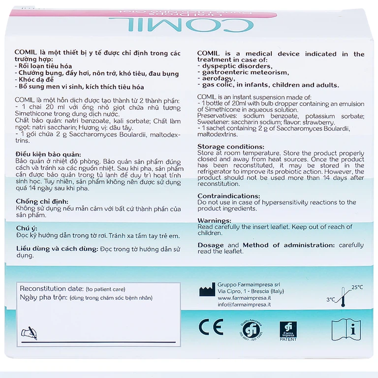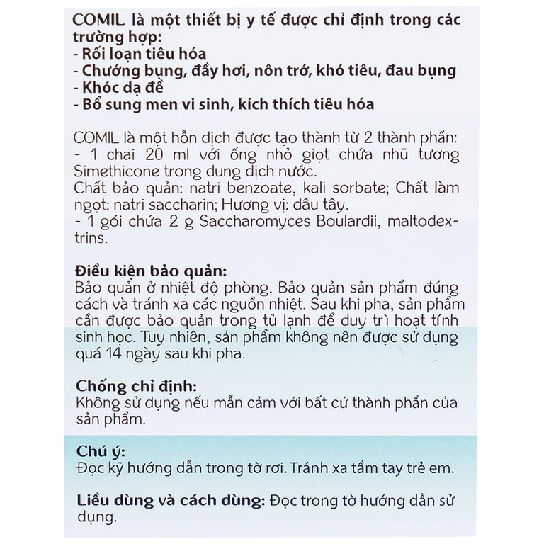 Comil là giải pháp hiệu quả được sử dụng cho trẻ em gặp vấn đề về đường tiêu hóa như: Rối loạn tiêu hóa, chướng bụng, đầy hơi, nôn trớ, khó tiêu, đau bụng, khóc dạ đề, bổ sung men vi sinh, kích thích tiêu hóa.