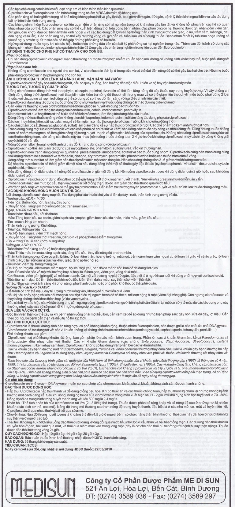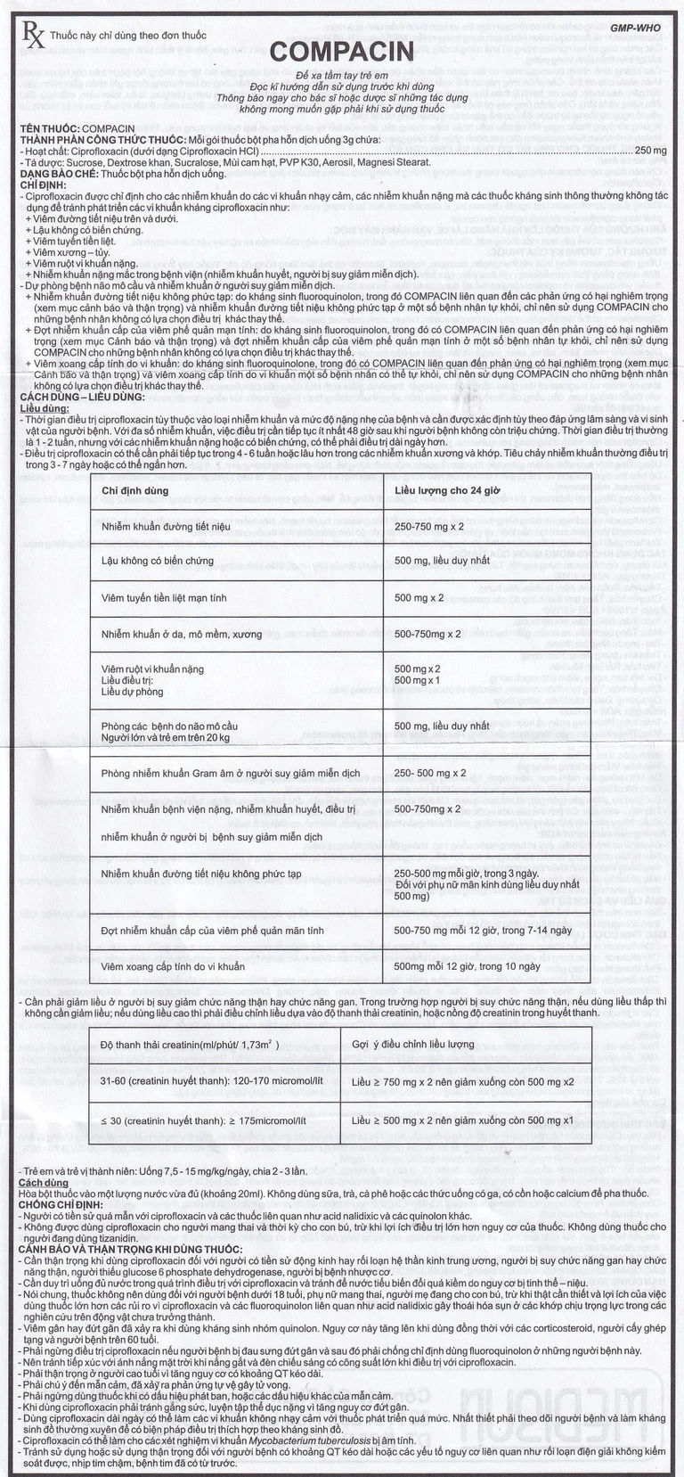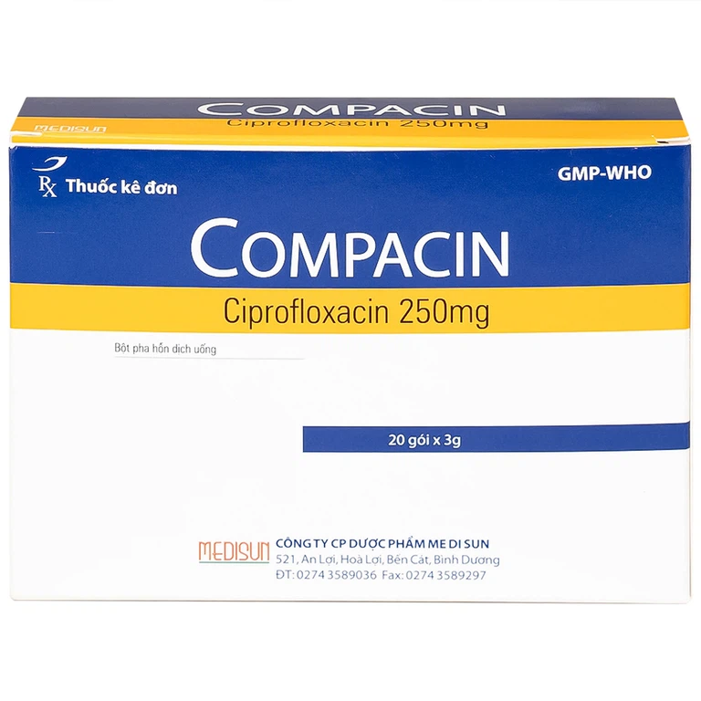 Bột pha hỗn dịch uống Compacin là sản phẩm của Công ty Cổ phần Dược phẩm Medisun chứa hoạt chất Ciprofloxacin được chỉ định cho các nhiễm khuẩn do các vi khuẩn nhạy cảm, dự phòng bệnh não mô cầu và nhiễm khuẩn ở người suy giảm miễn dịch.