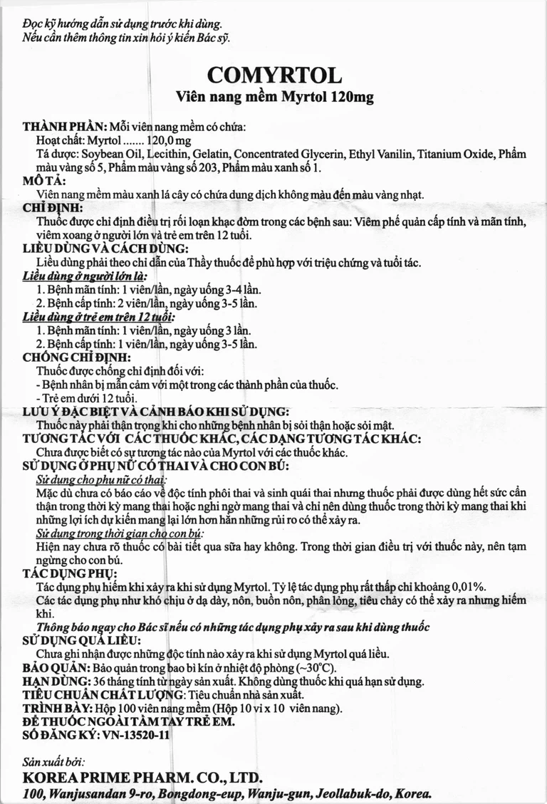 Thuốc Comyrtol là sản phẩm của Korea Prime Pharma chứa hoạt chất Myrtol dùng điều trị rối loạn khạc đờm trong trường hợp viêm phế quản cấp tính và mãn tính, viêm xoang ở người lớn và trẻ em trên 12 tuổi.