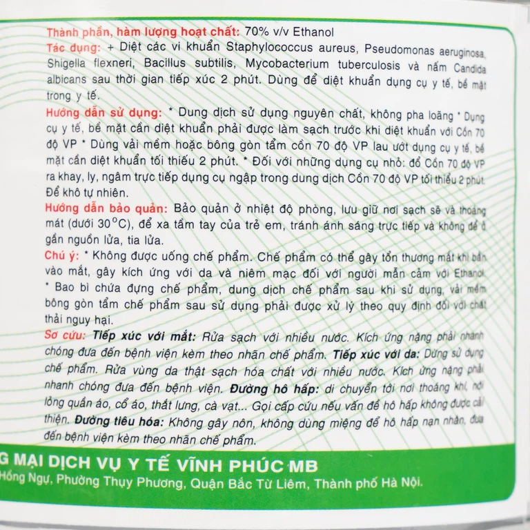 Cồn 70 độ Vĩnh Phúc 1000ml được dùng để diệt các vi khuẩn Staphylococcus aureus, Pseudomonas aeruginosa, Shigella flexneri, Bacillus subtilis, Mycobacterium tuberculosis và nấm Candida albicans sau thời gian tiếp xúc 2 phút. Dùng để diệt khuẩn dụng cụ y tế, bề mặt trong y tế.