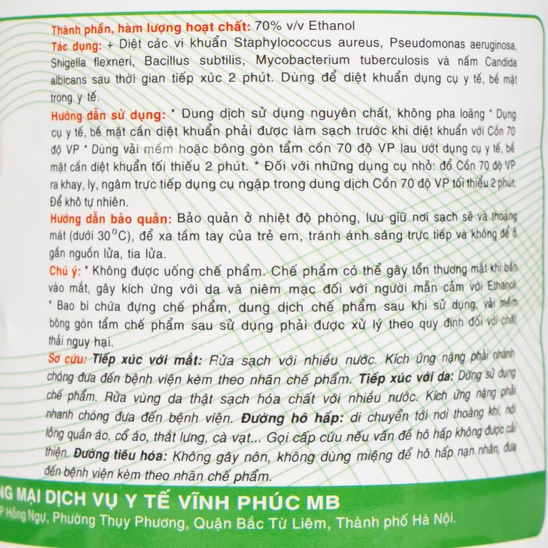 Cồn 70 độ Vĩnh Phúc 500ml được dùng để diệt các vi khuẩn Staphylococcus aureus, Pseudomonas aeruginosa, Shigella flexneri, Bacillus subtilis, Mycobacterium tuberculosis và nấm Candida albicans sau thời gian tiếp xúc 2 phút. Dùng để diệt khuẩn dụng cụ y tế, bề mặt trong y tế.
