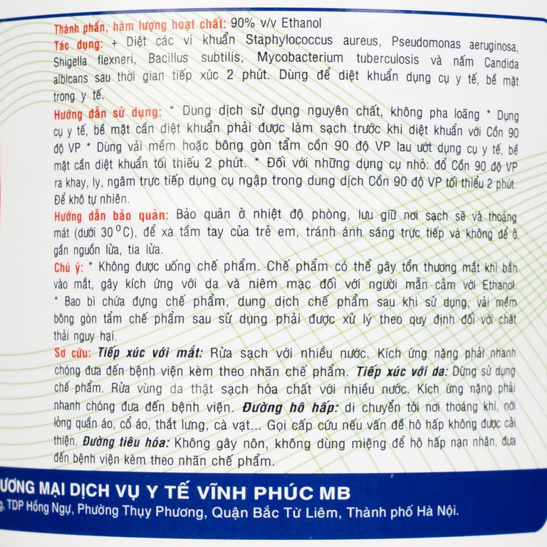 Cồn 90 độ Vĩnh Phúc được dùng để diệt các vi khuẩn Staphylococcus aureus, Pseudomonas aeruginosa, Shigella flexneri, Bacillus subtilis, Mycobacterium tuberculosis và nấm Candida albicans sau thời gian tiếp xúc 2 phút. Dùng để diệt khuẩn dụng cụ y tế, bề mặt trong y tế.
