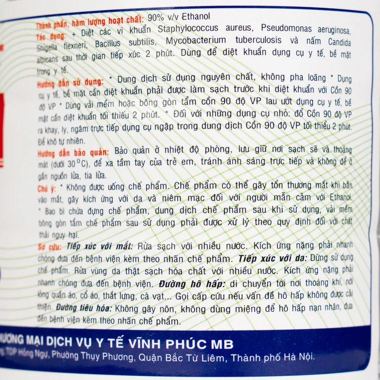Cồn 90 độ Vĩnh Phúc 500ml được dùng để diệt các vi khuẩn Staphylococcus aureus, Pseudomonas aeruginosa, Shigella flexneri, Bacillus subtilis, Mycobacterium tuberculosis và nấm Candida albicans sau thời gian tiếp xúc 2 phút. Dùng để diệt khuẩn dụng cụ y tế, bề mặt trong y tế.