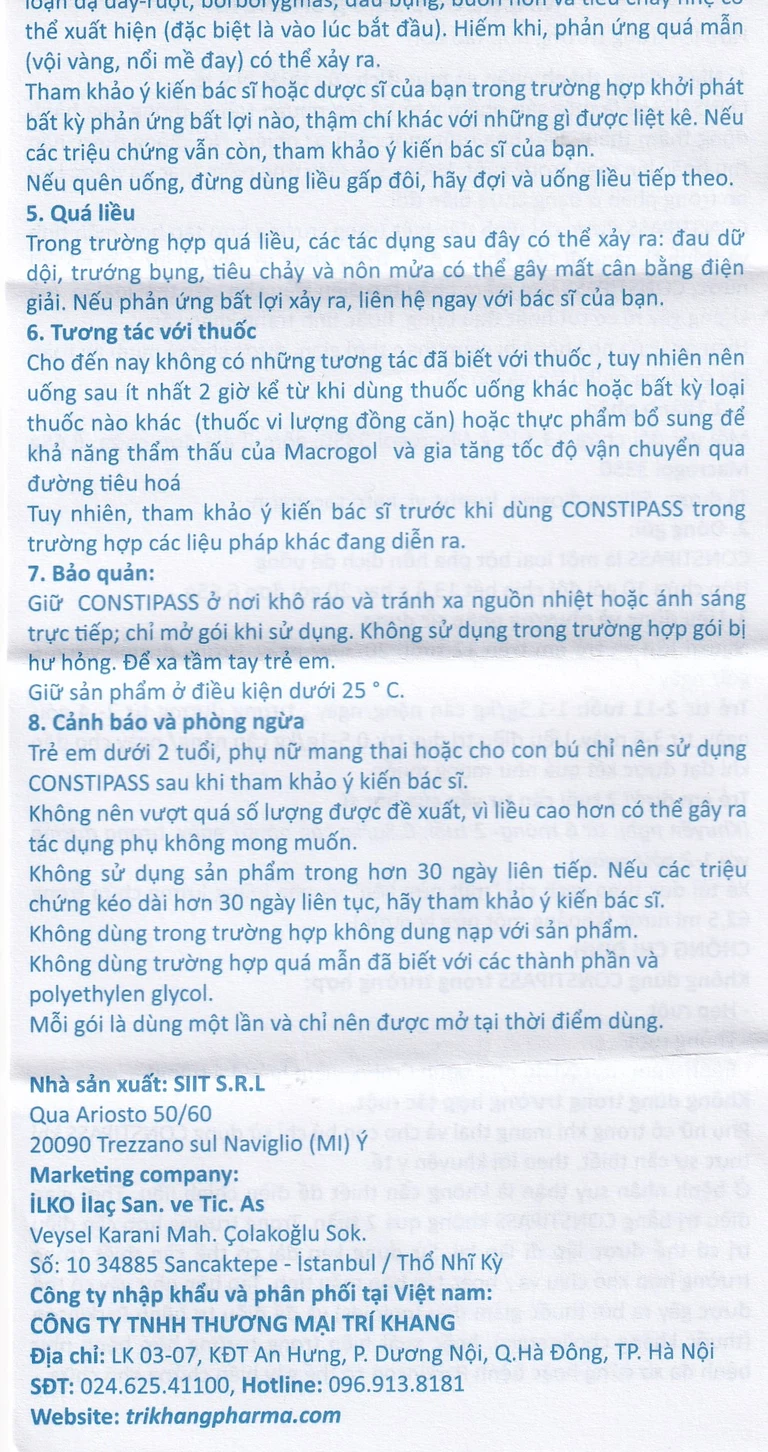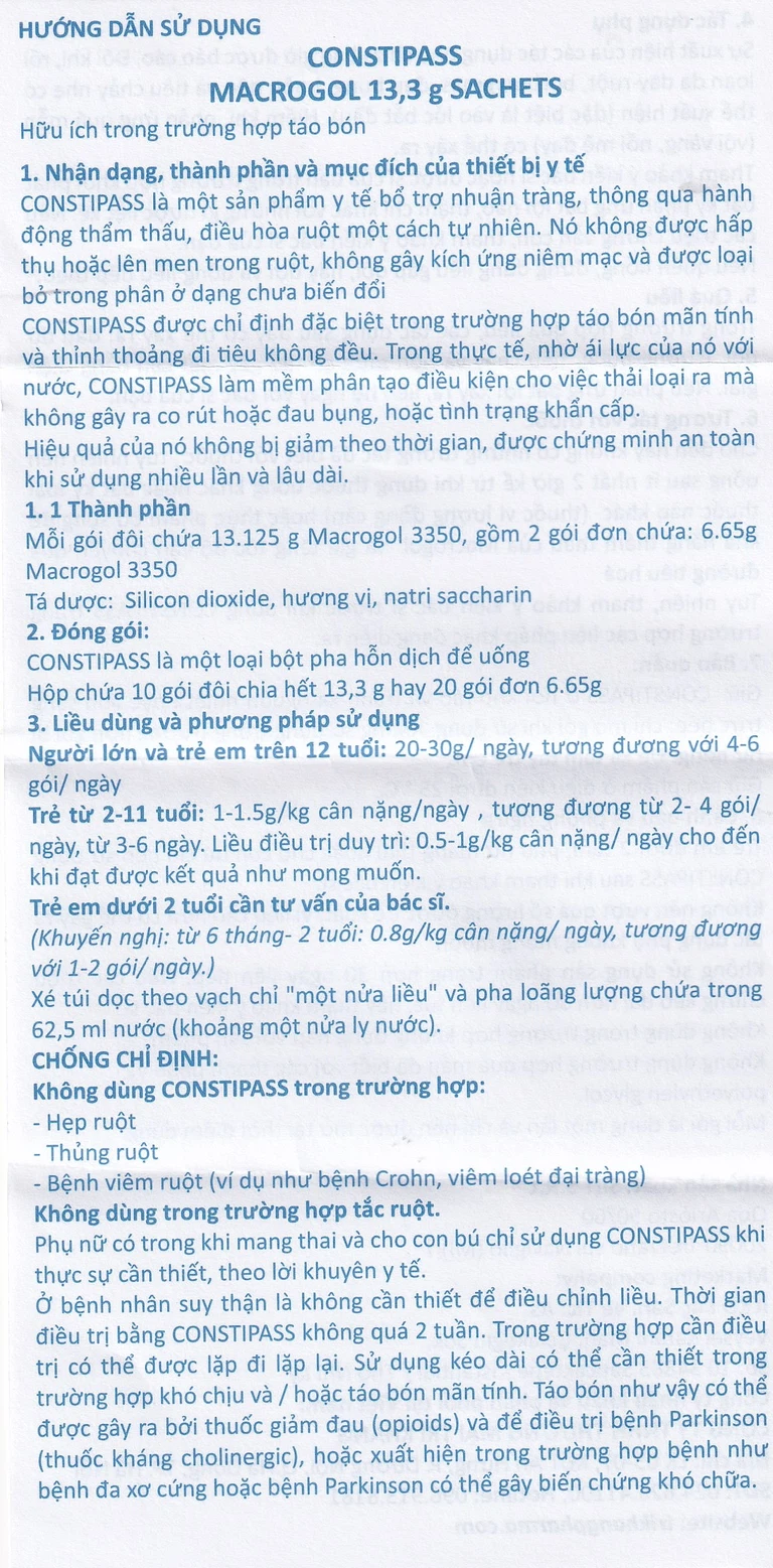 - Constipass tạo điều kiện thuận lợi cho việc đại tiện ở trẻ em và người lớn bị táo bón cấp tính và mãn tính.