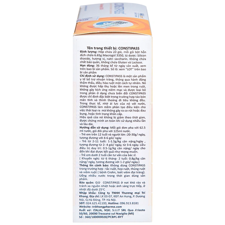 Constipass là sản phẩm bột nhuận tràng trị táo bón thông qua cơ chế hoạt động thẩm thấu, điều hòa ruột một cách tự nhiên. Sản phẩm không được hấp thụ hoặc lên men trong ruột, không gây kích ứng niêm mạc và được loại bỏ trong phân ở dạng chưa biến đổi. Bột nhuận tràng Constipass được chỉ định đặc biệt trong trường hợp táo bón mãn tính và thỉnh thoảng đi tiêu không đều.