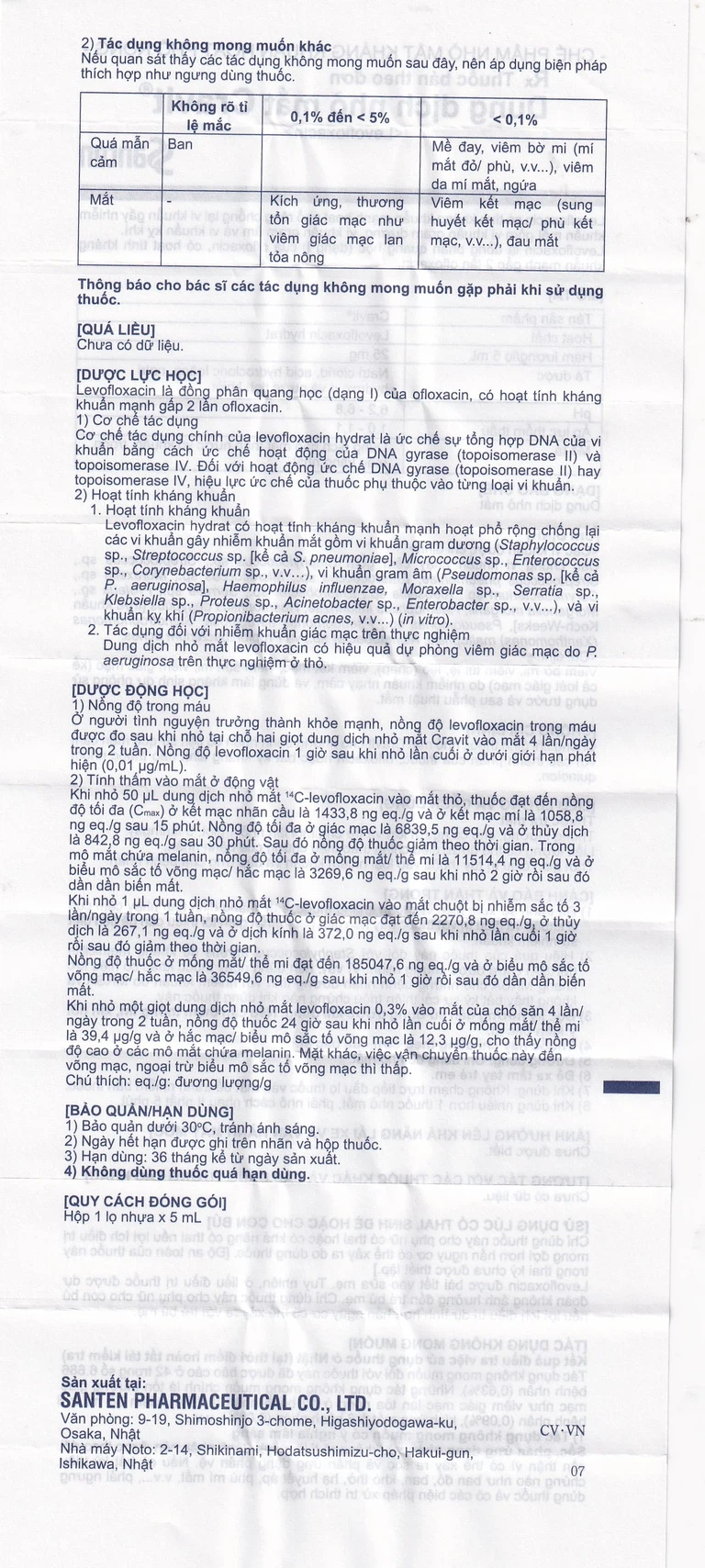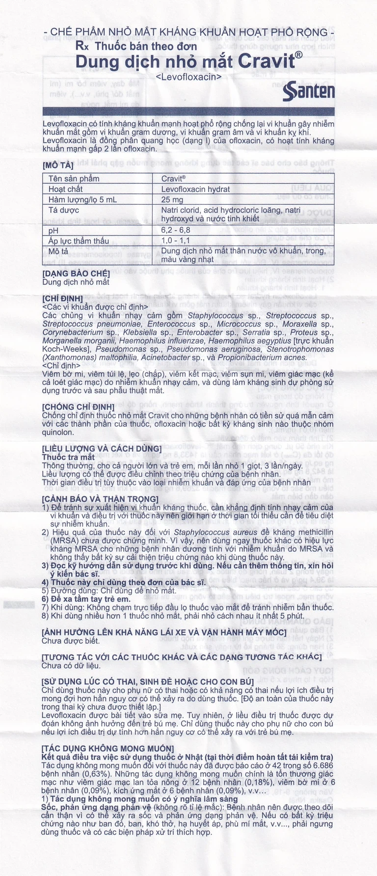 Nồng độ trong máu: Ở người tình nguyện trưởng thành khỏe mạnh, nồng độ levofloxacin trong máu được đo sau khi nhỏ tại chỗ hai giọt dung dịch nhỏ mắt Cravit vào mắt 4 lần/ngày trong 2 tuần. Nồng độ levofloxacin 1 giờ sau khi nhỏ lần cuối ở dưới giới hạn phát hiện (0,01 µg/ml).
