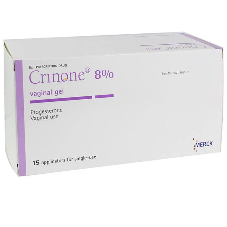 Crinone 8% của Công ty Central Pharma, thành phần chính là progesterone. Thuốc dùng điều trị các rối loạn liên quan đến sự thiếu hụt progesterone như: Vô sinh do giai đoạn hoàng thể không hoàn chỉnh, sử dụng thụ tinh trong ống nghiệm, khi nguyên nhân vô sinh chủ yếu do vòi trứng, tự phát hoặc vô sinh do lạc nội mạc tử cung liên quan với các chu kỳ rụng trứng bình thường. Crinone 8% được bào chế dưới dạng gel dùng đường âm đạo. Hộp 15 ống.