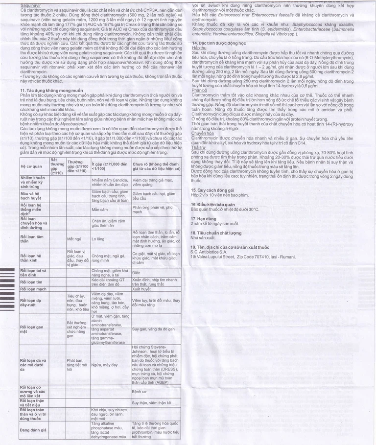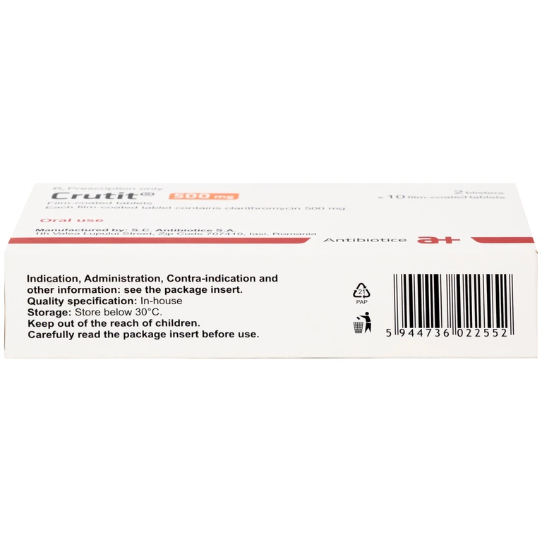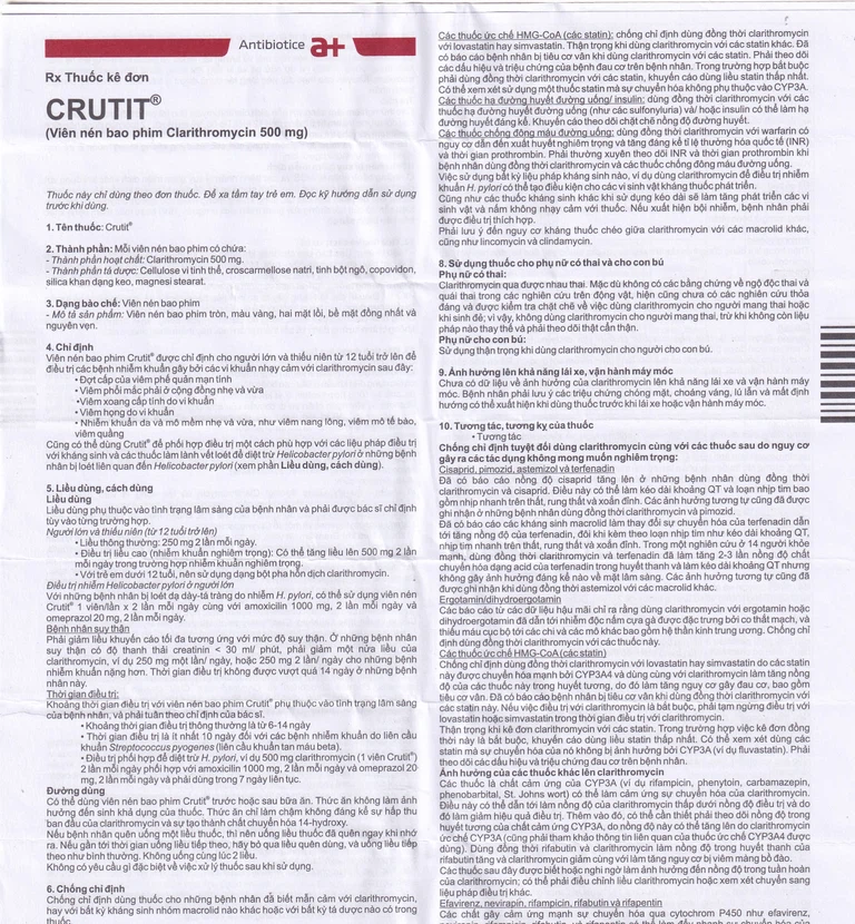 Thuốc Crutit 500 là sản phẩm của S.C Antibiotice, có thành phần chính là Clarithromycin. Đây là thuốc được sử dụng để điều trị các bệnh nhiễm khuẩn gây bởi các vi khuẩn nhạy cảm với clarithromycin, phối hợp điều trị một cách phù hợp với các liệu pháp điều trị với kháng sinh và các thuốc làm lành vết loét để diệt trừ Helicobacter pylori ở những bệnh nhân bị loét liên quan đến Helicobacter pylori.