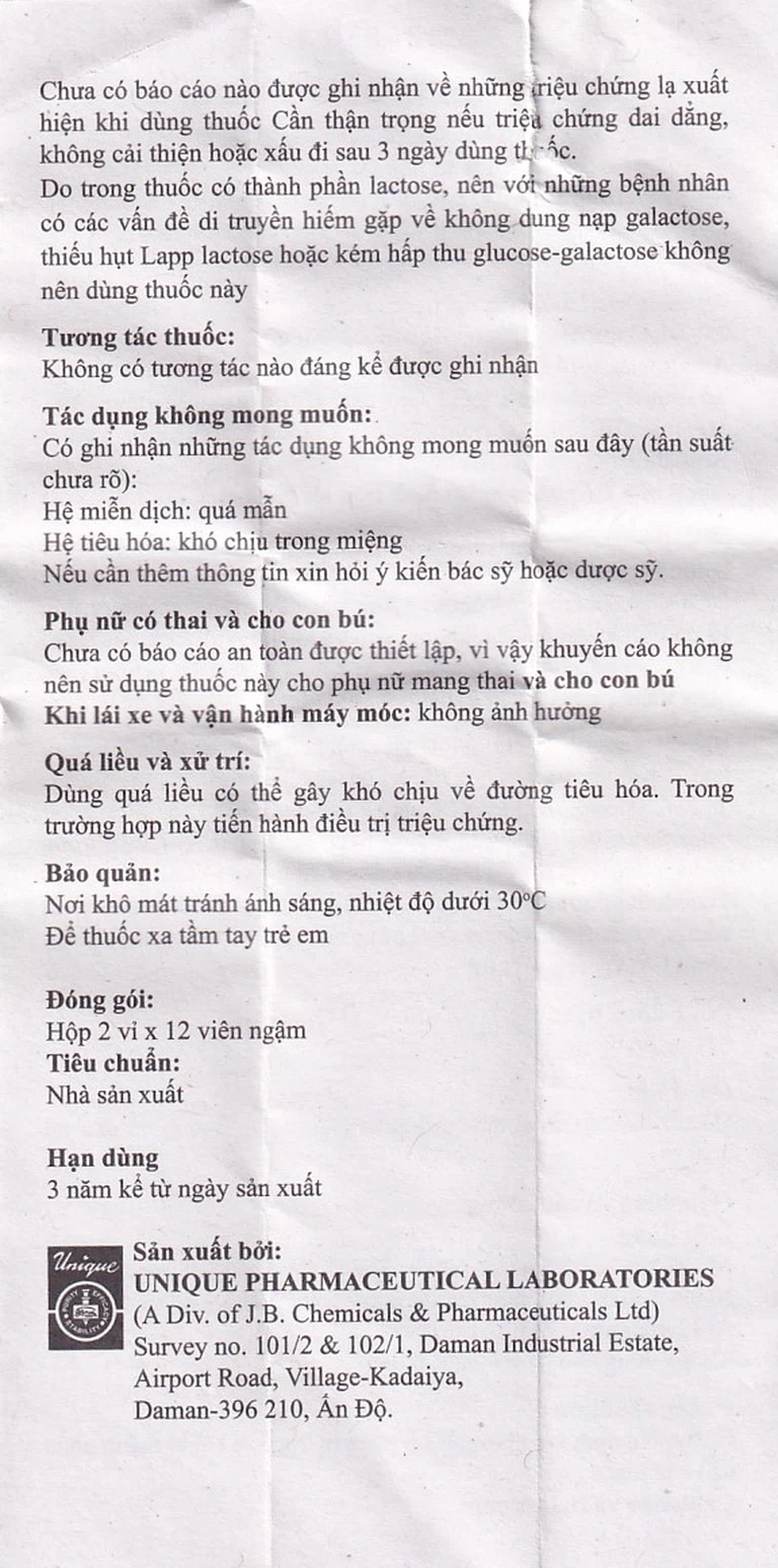 Chưa có báo cáo nào được ghi nhận về những triệu chứng lạ xuất hiện khi dùng thuốc. Cần thận trọng nếu triệu chứng dai dẳng, không cải thiện hoặc xấu đi sau 3 ngày dùng thuốc. Do trong thuốc có thành phần lactose , nên với những bệnh nhân có các vấn đề di truyền hiếm gặp về không dung nạp galactose, thiếu hụt lapp lactose hoặc kém hấp thu glucose – galactose không nên dùng thuốc này.