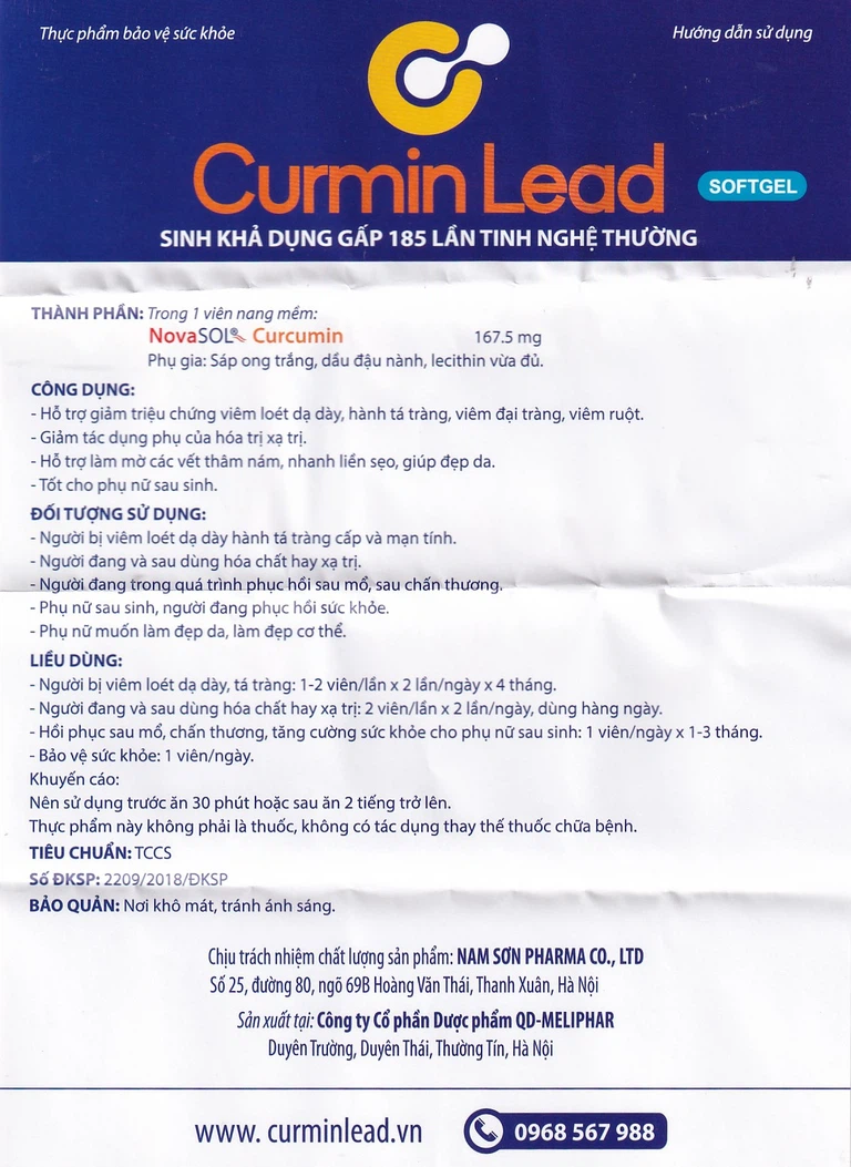 Curmin Lead Softgelsđược sản xuất bởicông ty Cổ phần Dược phẩm QD-Meliphar. Được thành lập từ ngày 8/4/2003, Dược phẩm QD-Meliphar đã tạo dựng được một nền tảng vững chắc và tự tin khẳng định về chất lượng sản phẩm dịch vụ cung cấp ra thị trường. Dược phẩm QD-Meliphar đủ điều kiện sản xuất thực phẩm bảo vệ sức khỏe theo yêu cầu thực hành tốt (GMP) đối với các dạng sản phẩm sau: viên nén, viên nén bao phim, viên nang cứng, viên nang mềm, cốm, bột, siro, dung dịch.