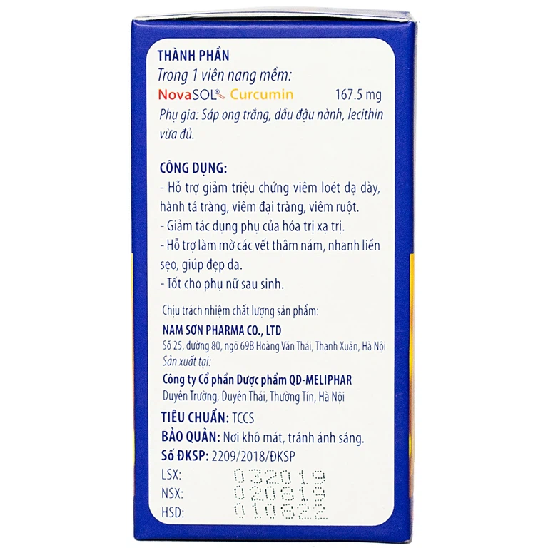 Novasol curcumingiúp bảo vệ cơ thể khỏi tổn thương tế bào do tiếp xúc với ánh nắng mặt trời, độc tố ảnh hưởng đến da. Do đó, Curmin Lead Softgels có tác dụng hỗ trợ giảm mụn trứng cá, ngứa và viêm da, đồng thời tăng hồng cầu, giúp da dẻ hồng hào, trắng sáng, khỏe mạnh.