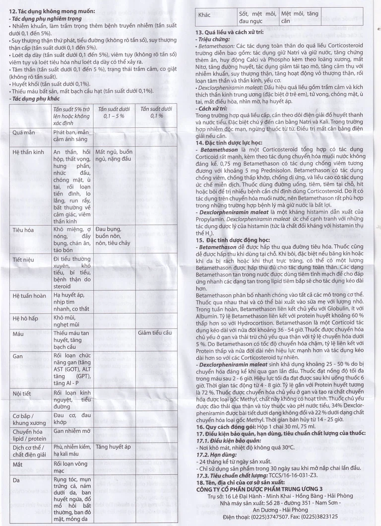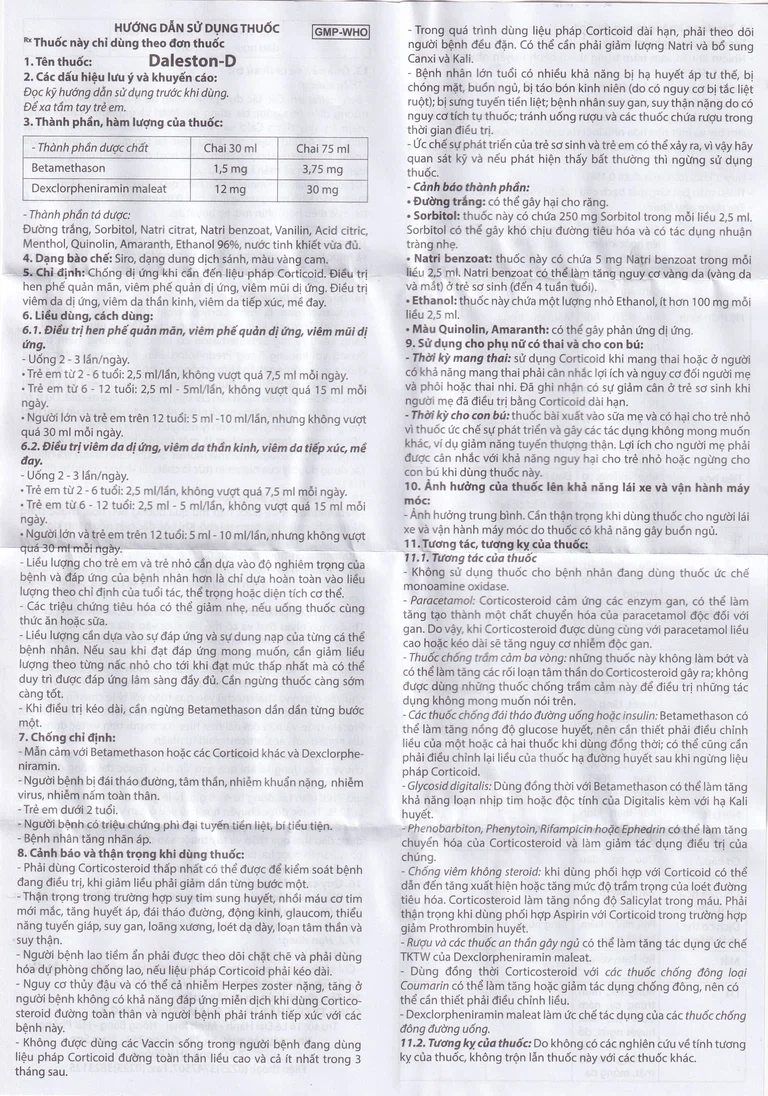 Thuốc Daleston-D là sản phẩm của Dược phẩm Trung Ương 3, thành phần chính là Betamethason và Dexclorpheniramin Maleat. Daleston-D là thuốc chống dị ứng khi cần đến liệu pháp corticoid, đều trị hen phế quản mãn, viêm phế quản dị ứng, viêm mũi dị ứng, viêm da dị ứng, viêm da thần kinh, viêm da tiếp xúc, mề đay.Dạng bào chế của Daleston-D là siro, dung dịch sánh, màu vàng cam. Đóng gói theo quy cách hộp 1 chai 30 ml.