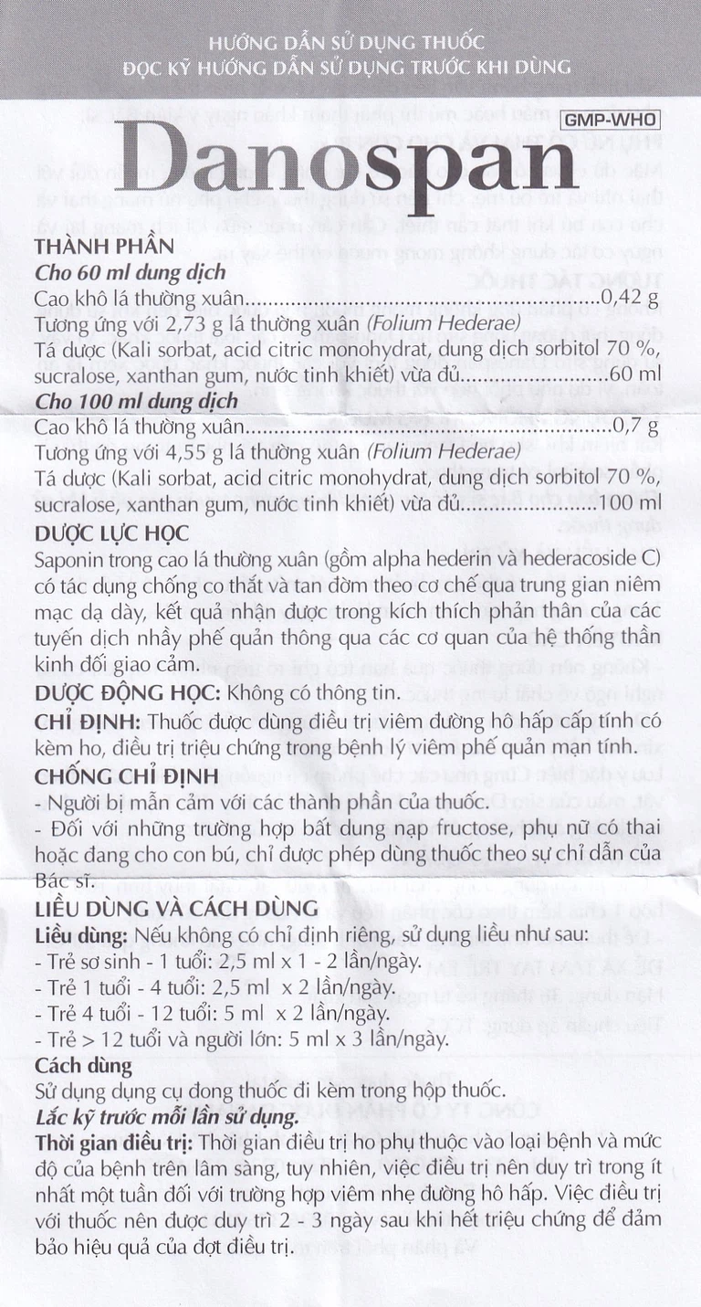 Siro ho Danospan là sản phẩm của Công ty Cổ phần Dược Danapha có thành phần chính là cao khô lá thường xuân dùng điều trị viêm đường hô hấp cấp tính có kèm ho, điều trị triệu chứng trong bệnh lý viêm phế quản mạn tính.
