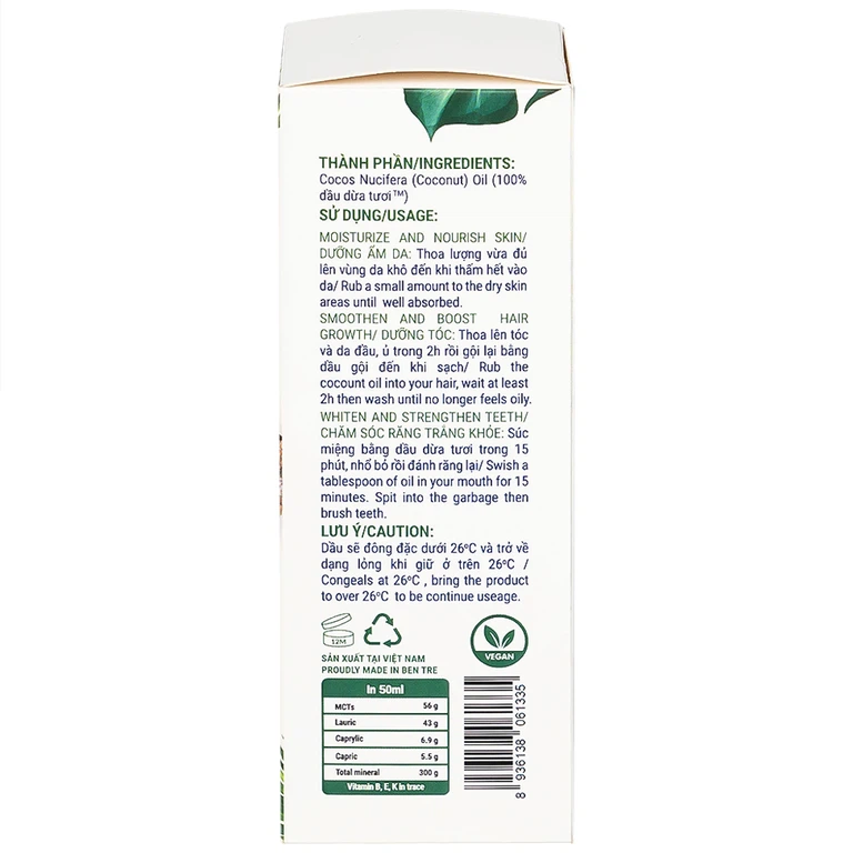 100% dầu dừa tươi:Giữ nguyên các thành phần MCTs như Lauric, Caprylic và Capric acid cùng với các vi lượng khoáng chất và vitamin, giúp phục hồi và nuôi dưỡng da, tóc hiệu quả.