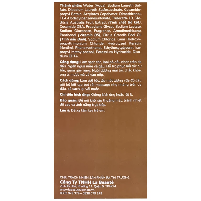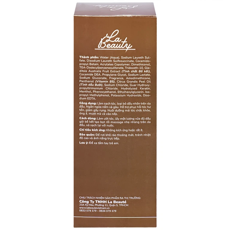 Dầu gội bồ kết La Beauty được chiết xuất 100% từ thiên nhiên gồm tinh chất bồ kết cô đặc, tinh dầu bưởi và các loại thảo dược khác. Với phương thức cô đặc từ bồ kết và thảo dược kết hợp với công nghệ kháng khuẩn giúp da đầu được thông thoáng, mái tóc của bạn sẽ trở nên dày và óng mượt hơn. Đồng thời, sản phẩm còn hỗ trợ làm giảm tình trạng rụng tóc và phục hồi tóc hư tổn.