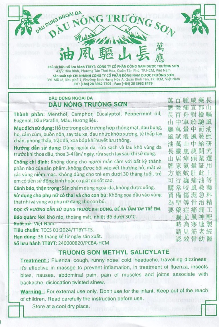 Dầu nóng Trường Sơn được dùng hỗ trợ trong các trường hợp chóng mặt, đau bụng, ho, cảm cúm, buồn nôn, say tàu xe, đau nhức khớp xương,…