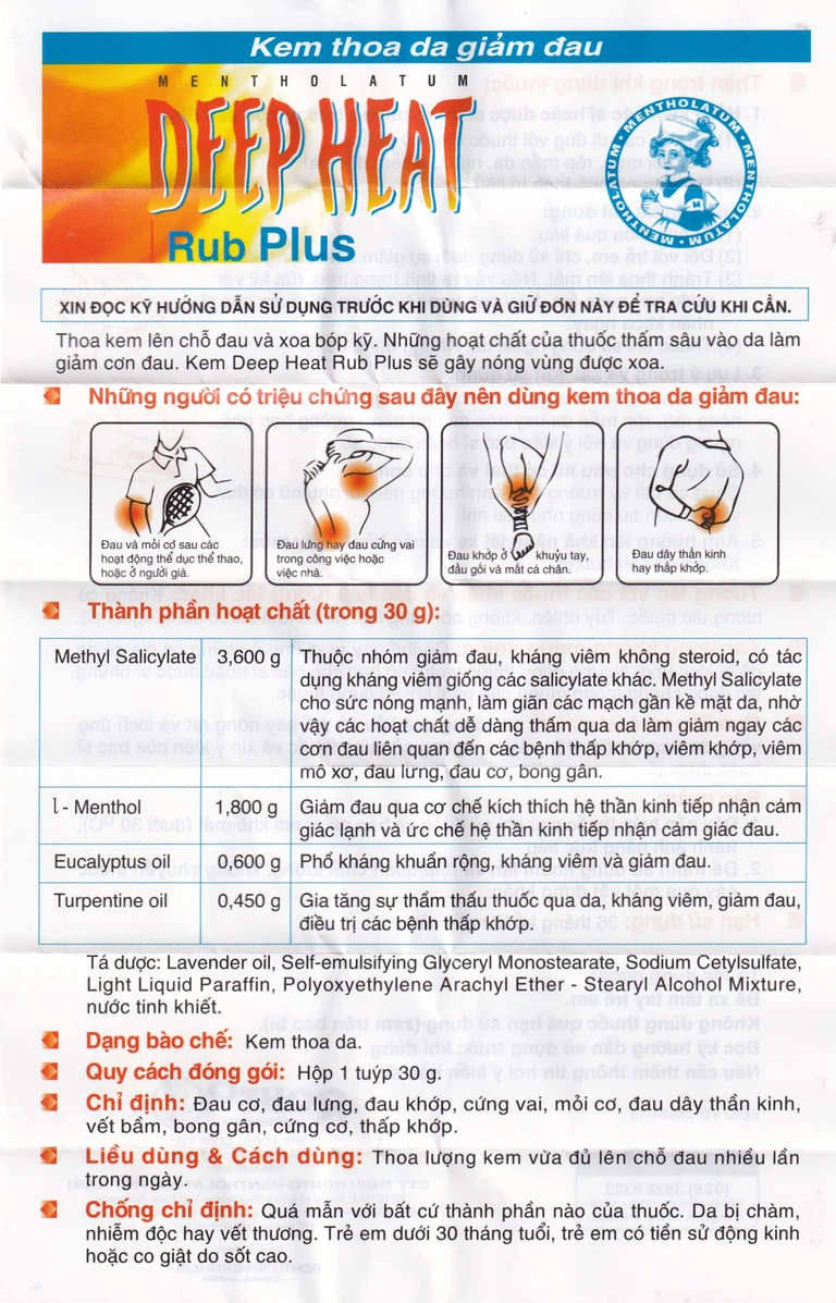Thoa kem lên chỗ đau và xoa bóp kỹ. Những hoạt chất của thuốc sẽ thấm nhanh đến tận gốc và làm dứt cơn đau. Xoa bóp bằng kem Deep Heat Rub Plus sẽ cho hiệu quả kháng viêm giảm đau rất tốt.