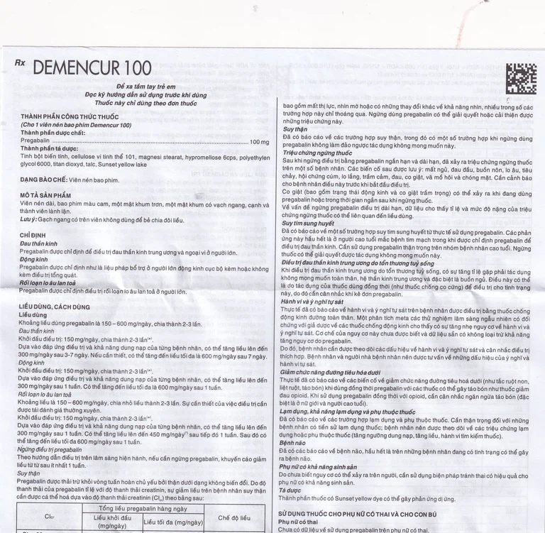 (*) Demencur 100 không phù hợp về liều dùng cho trường hợp này. Có thể dùng Demencur 50, Demencur 75 hoặc chế phẩm khác có hàm lượng phù hợp.