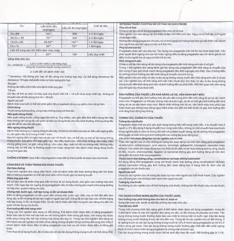 Khoảng liều dùng pregabalin là 150 – 600 mg/ngày, chia thành 2 – 3 lần.
