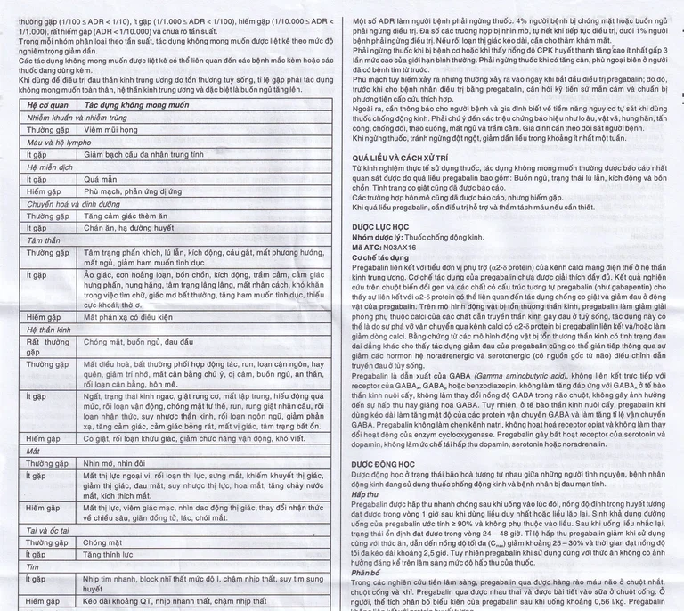 Từ kinh nghiệm thực tế sử dụng thuốc, tác dụng không mong muốn thường được báo cáo nhất quan sát được do quá liều pregabalin bao gồm: Buồn ngủ, trạng thái lú lẫn, kích động và bồn chồn. Tình trạng co giật cũng đã được báo cáo.