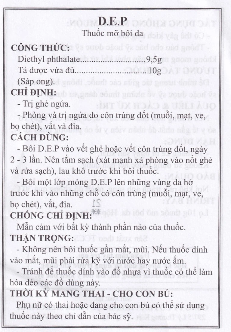 Bôi D.E.P vào vết ghẻ hoặc vết côn trùng đốt, ngày 2 – 3 lần.