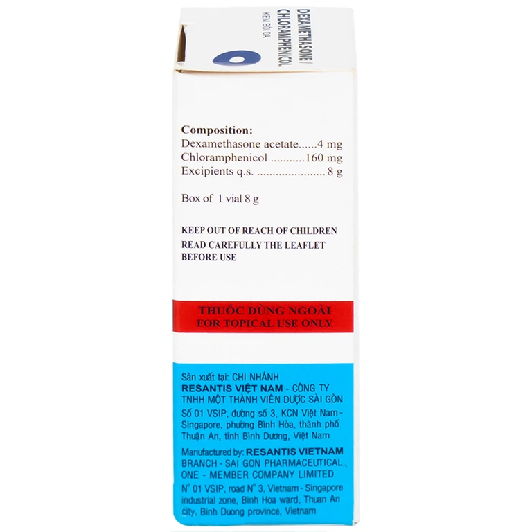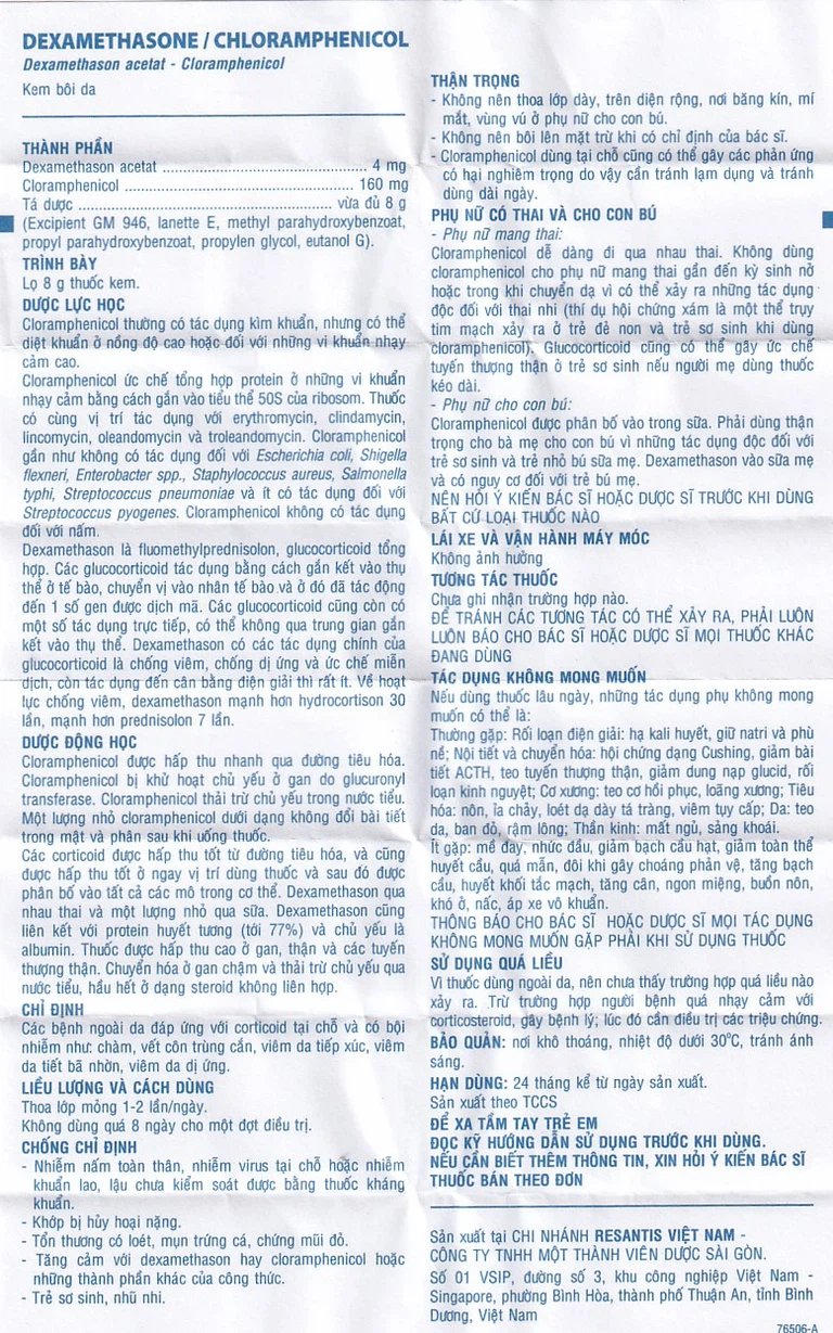 Kem bôi da Dexamethasone/Chloramiphenicol là sản phẩm của Resantis Việt Nam có chứa hoạt chất Dexamethasone acetate và Chloramphenicol. Đây là thuốc dùng điều trị các bệnh ngoài da đáp ứng với corticoid tại chỗ và có bội nhiễm như: Chàm, vết côn trùng cắn, viêm da tiếp xúc, viêm da tiết bã nhờn, viêm da dị ứng.