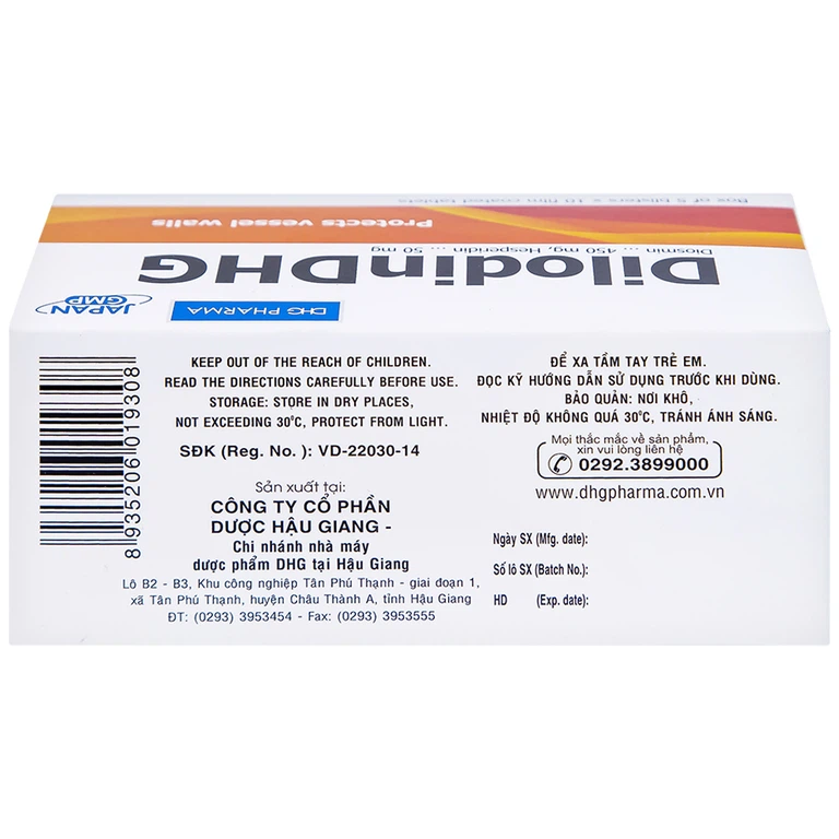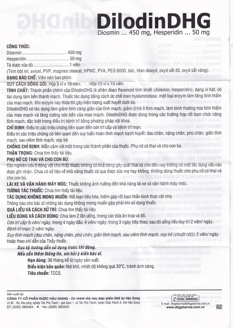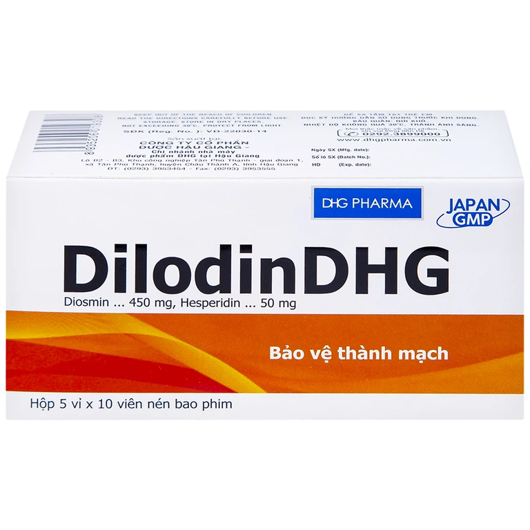 Thuốc Dilodin Dhg của Công ty Cổ phần Dược Hậu Giang, thành phần chính Diosmin 450 mg, Hesperidin 50 mg là một loại thuốc dùng để điều trị bệnh trĩ. Thuốc cũng được dùng để điều trị suy tuần hoàn tĩnh mạch bạch huyết.