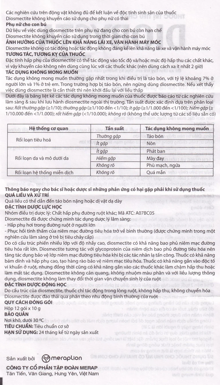 Do cấu trúc của diosmectite, thuốc chỉ tác động trong lòng ruột, không hấp thu, không chuyển hóa Diosmectite được đào thải qua phân theo nhu động bình thường của ruột.