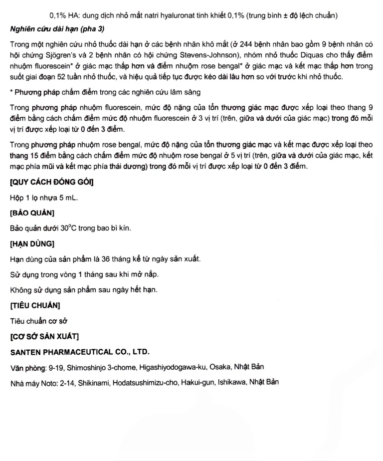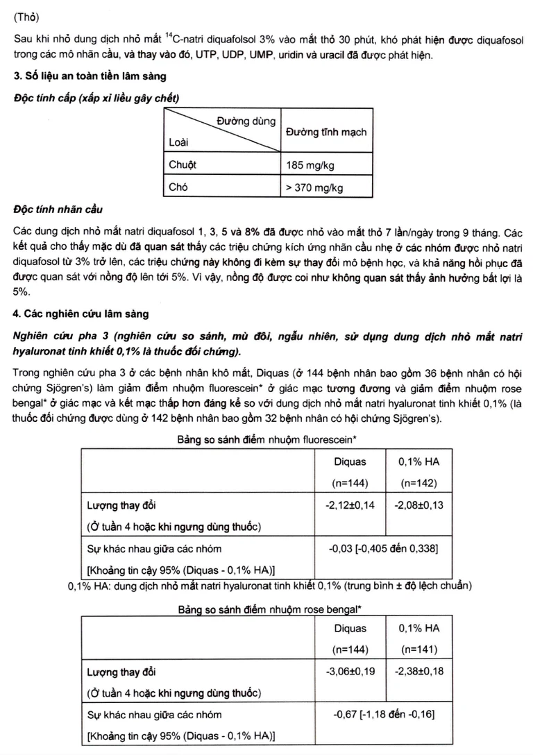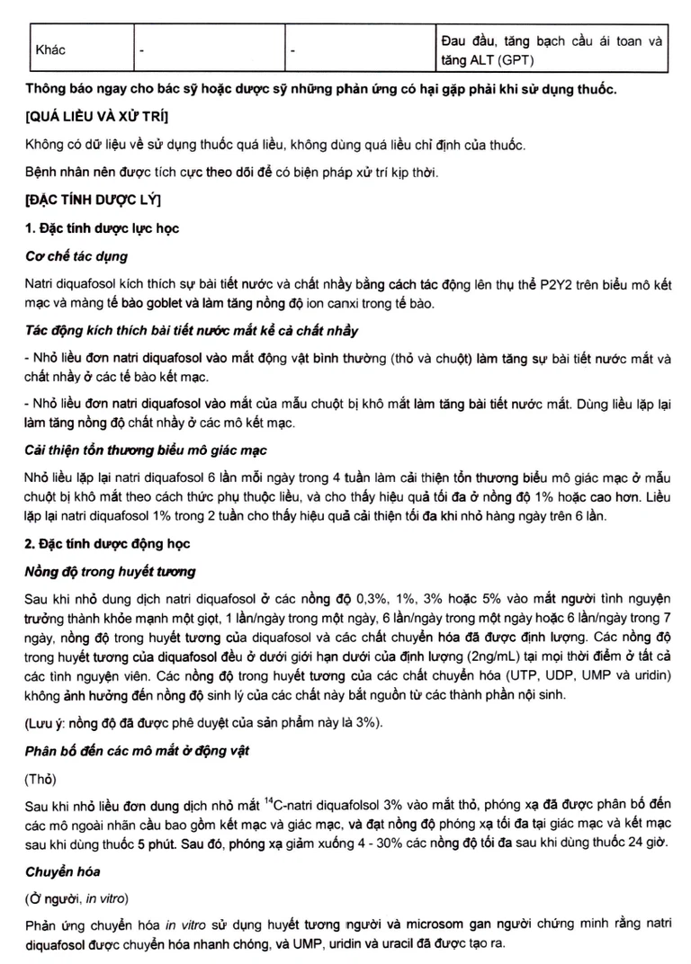 Hấp thu: Sau khi nhỏ vào mắt, nồng độ của natri diquafosol trong huyết tương rất thấp và không thể định lượng được.