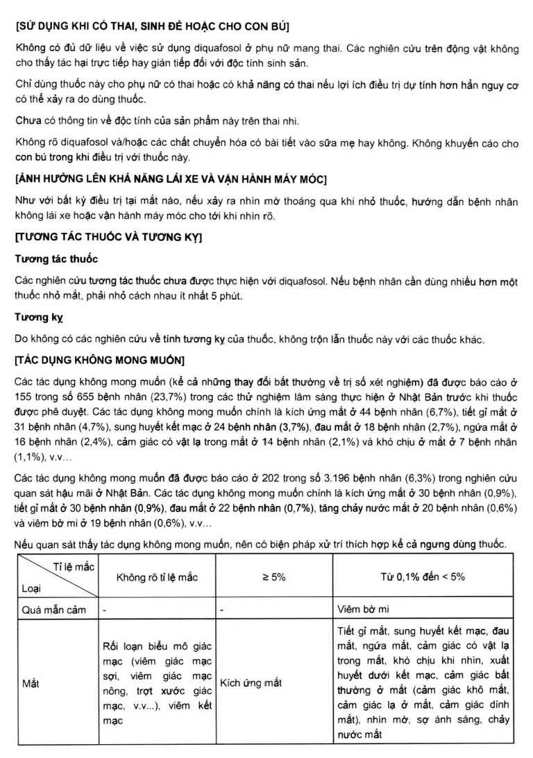 Chưa rõ khả năng bài tiết vào sữa mẹ của Natri diquafosol và/ hoặc các chất chuyển hoá. Khuyến cáo không nên cho con bú khi đang điều trị bằng thuốc này.