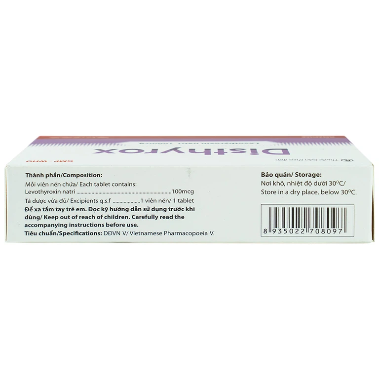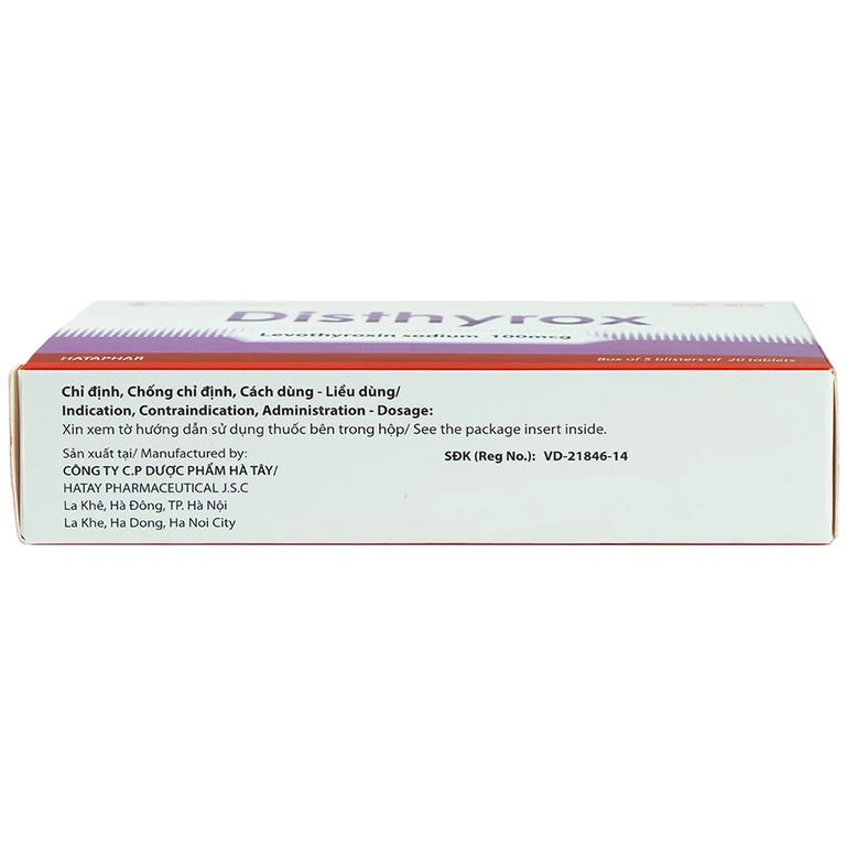Thuốc Disthyrox là sản phẩm của Công ty Cổ phần Dược phẩm Hà Tây, có thành phần chính là Levothyroxine. Thuốc được chỉ định để điều trị thay thế hoặc bổ sung cho các hội chứng suy giáp do bất cứ nguyên nhân nào ở tất cả các lứa tuổi, tác dụng ức chế tiết thyrotropin (TSH) trong bướu cổ đơn thuần và trong bệnh viêm giáp mạn tính, phối hợp với các thuốc kháng giáp trong nhiễm độc giáp. Thuốc Disthyrox được bào chế dưới dạng viên nén. Hộp 5 vỉ x 20 viên nén.