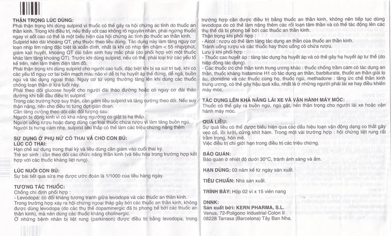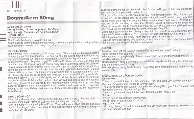 Thuốc DogmaKern là sản phẩm của Kern Pharma S.L, có thành phần chính là Sulpiride. Đây là thuốc được sử dụng để cho các trường hợp tâm thần phân liệt cấp và mạn tính, trạng thái loạn thần cấp tính, điều trị triệu chứng ngắn ngày chứng lo âu ở người lớn trong trường hợp thất bại với các điều trị thông thường, rối loạn hành vi nặng ở trẻ em đặc biệt trong hội chứng tự kỷ, điều trị ngắn các trạng thái kích động, hung hăng gây gổ trong trạng thái loạn thần cấp và mãn tính.