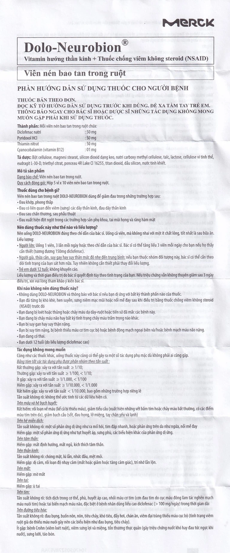 Ở bệnh nhân bị bệnh tim mạch , diclofenac có thể gây ứ dịch hoặc phù. Việc điều trị diclofenac, đặc biệt ở liều > 100 mg/ngày và dài hạn, có thể liên quan với tăng nguy cơ biến cố huyết khối động mạch như nhồi máu cơ tim hoặc đột quỵ. Khuyến cáo theo dõi đặc biệt và những bệnh nhân có yếu tố nguy cơ tim mạch (ví dụ tăng huyết áp, tăng lipid máu, bệnh đái tháo đường và hút thuốc lá) chỉ nên sử dụng DOLO-NEUROBION® sau khi cân nhắc cẩn thận.