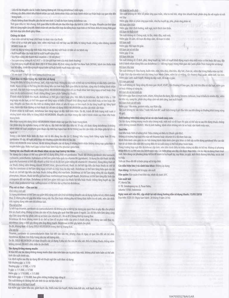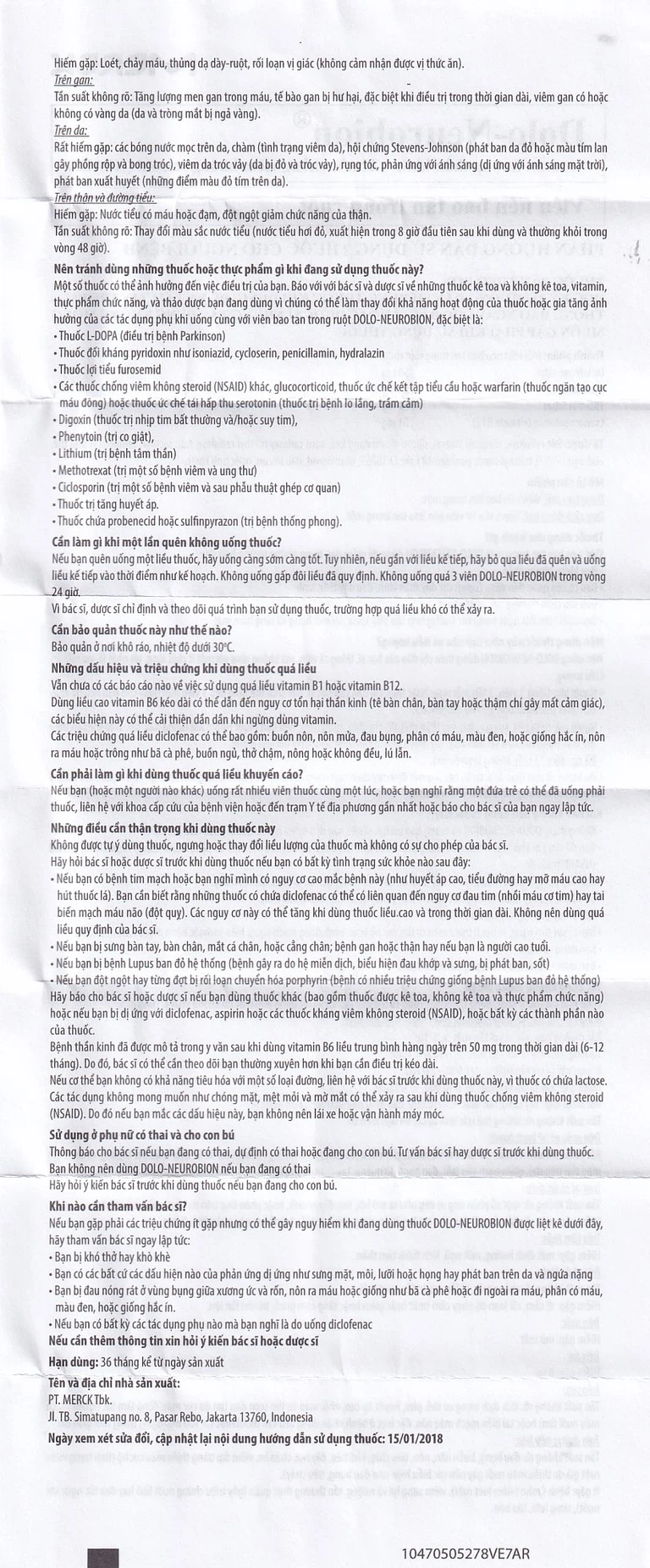 Trong khi điều trị bằng diclofenac, loét, chảy máu hoặc thủng dạ dày ruột có thể xảy ra mà không có dấu hiệu cảnh báo trước. Nguy cơ này có thể tăng lên khi dùng liều cao hơn hoặc thời gian điều trị dài hơn, cũng như ở những bệnh nhân cao tuổi. Đặc biệt thận trọng khi dùng DOLO-NEUROBION® đồng thời với các thuốc khác làm tăng nguy cơ loét hoặc chảy máu (ví dụ corticosteroid, thuốc chống đông).
