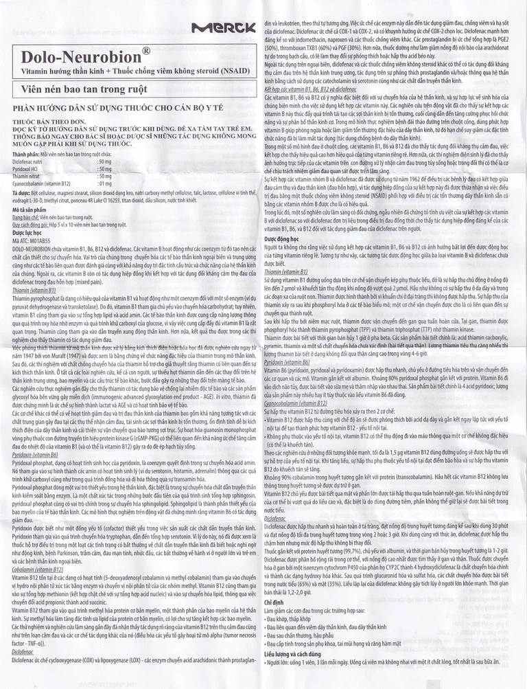 DOLO-NEUROBION® chứa vitamin B1, B6, B12 và diclofenac. Các vitamin B hoạt động như các coenzym từ đó tạo nên các chất cần thiết cho sự chuyển hóa. Vai trò của chúng trong chuyển hóa các tế bào thần kinh ngoại biên và trung ương cũng như các tế bào liên quan được đánh giá cùng với khả năng duy trì đặc tính cấu trúc và chức năng của hệ thần kinh của chúng. Ngoài ra, các vitamin B còn có tác dụng hiệp đồng khi kết hợp với tác dụng đối kháng cảm thụ đau của diclofenac trong đau hỗn hợp (mixed pain).