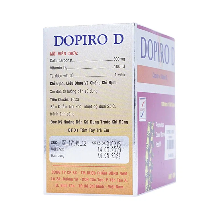 Thuốc Dopiro D là sản phẩm được sản xuất bởi Công ty cổ phần sản xuất – thương mại Dược phẩm Đông Nam, thuốc có thành phần chính là calci carbonat và vitamin D3. Dopiro D bổ sung vitamin và canxi cho cơ thể trong các tình trạng thiếu calci (còi xương, loãng xương, suy dinh dưỡng, tetani) và trường hợp gia tăng nhu cầu calci (trẻ em đang lớn, mẹ mang thai, mẹ cho con bú).Dopiro D được bào chế dưới dạng viên nang mềm.