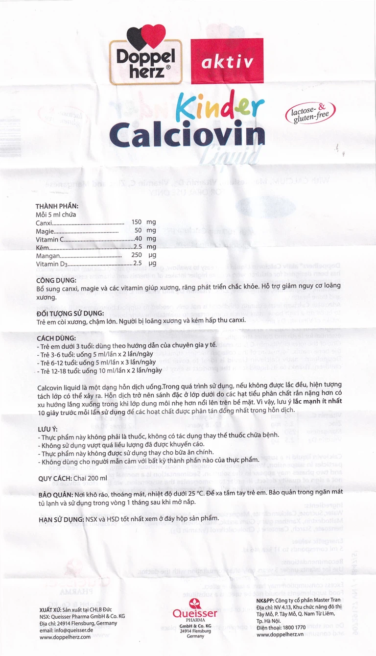 Kinder Calciovin Liquidlà thức uống bổ sung canxi, vitamin và khoáng chất thiết yếu cho trẻ, giúp hỗ trợ phát triển chiều cao và hệ xương răng chắc khỏe, phòng ngừa chậm lớn, còi xương ở trẻ và phòng ngừa nguy cơ loãng xương ở người già.