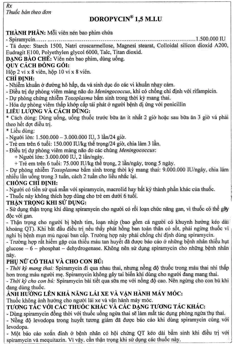 Spiramycin đi qua nhau thai, nhưng nồng độ thuốc Doropycin 1,5 M.I.U trong máu thai nhi thấp hơn trong máu người mẹ. Spiramycin không gây tai biến khi dùng cho người đang mang thai.