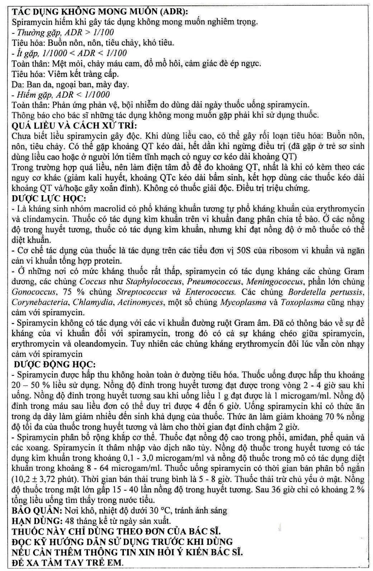 - Phản ứng phản vệ, bội nhiễm do dùng dài ngày thuốc uống spiramycin.