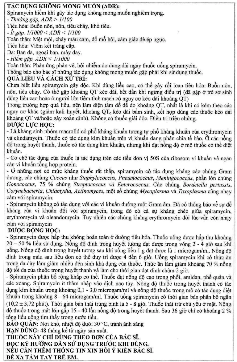 - Hiếm gặp: Phản ứng phản vệ, bội nhiễm do dùng dài ngày thuốc uống spiramycin.