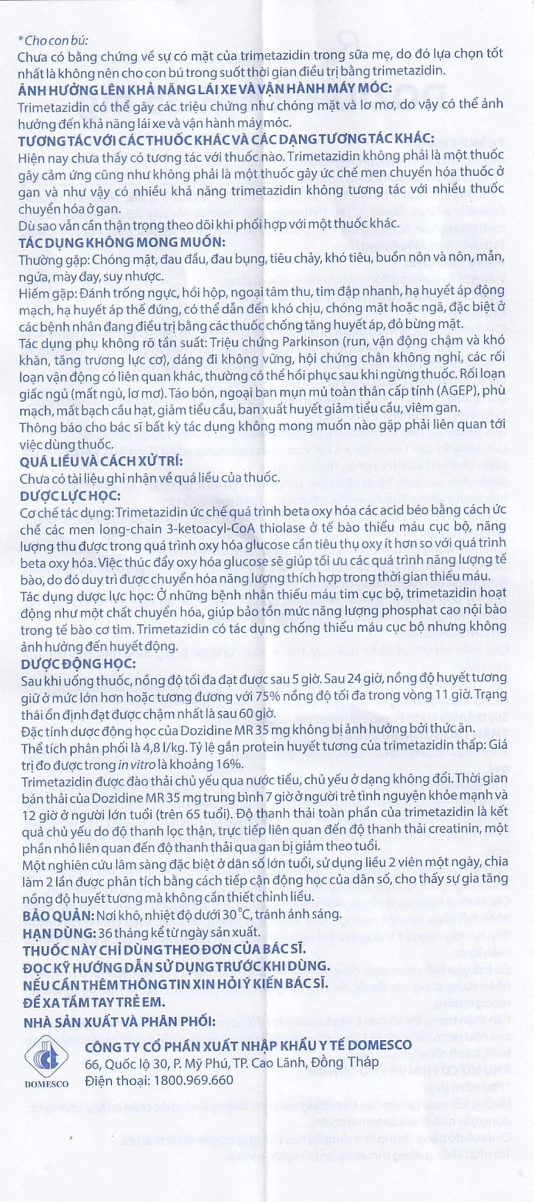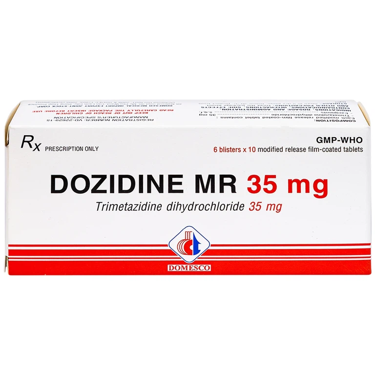 Thuốc Dozidine Mr 35 mg chứa hoạt chất Trimetazidine dùng để hỗ trợ trong điều trị đau thắt ngực ổn định không được kiểm soát đầy đủ bằng các liệu pháp khác.