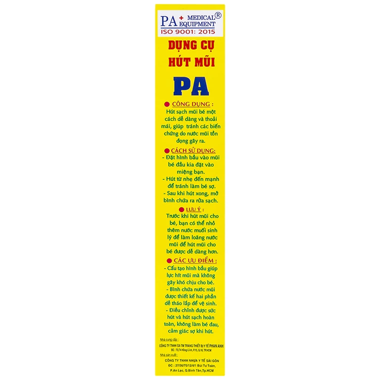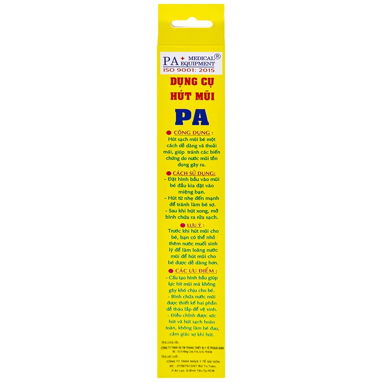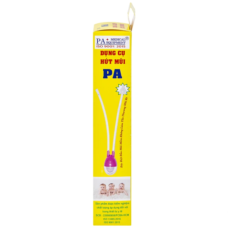 Dụng cụ hút mũi cho trẻ em PA là sản phẩm giúp mẹ hút mũi cho bé một cách dễ dàng và thoải mái, tránh các biến chứng do tồn đọng nước mũi gây ra. Với thiết kế ống bầu dục làm bằng nhựa PC không độc hại, giúp điều chỉnh lực hút mũi cho bé không làm bé đau hay khó chịu khi sử dụng. Ngoài ra, ống hút và đầu hút sử dụng chất liệu Silicon mềm mại đảm bảo an toàn và vệ sinh cho bé.