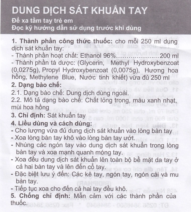Dung dịch dát khuẩn tay của Dược – Thiết bị y tế Bình Định (BIDIPHAR), với thành phần chính là Ethanol 96%. Dung dịch sát khuẩn tay được dùng để sát khuẩn trên tay hoặc các bề mặt tiếp xúc. Dạng bào chế dung dịch dùng ngoài, mỗi 250 ml có 200 ml Ethanol 96%, quy cách đóng gói: Chai 250 ml.