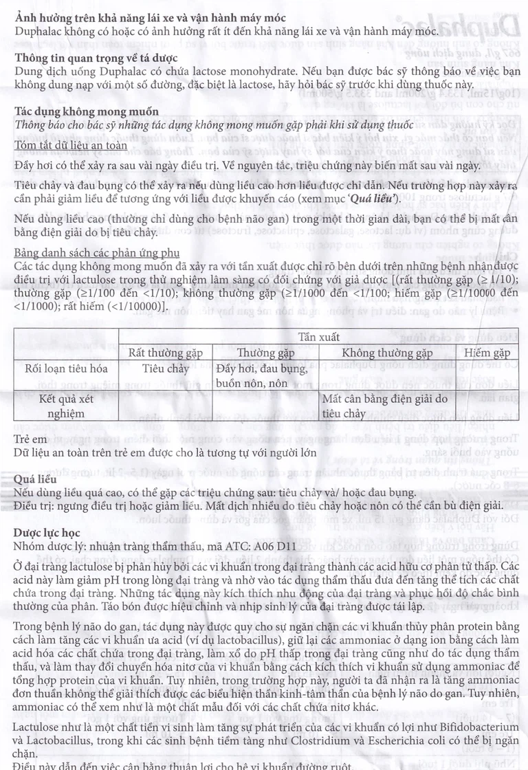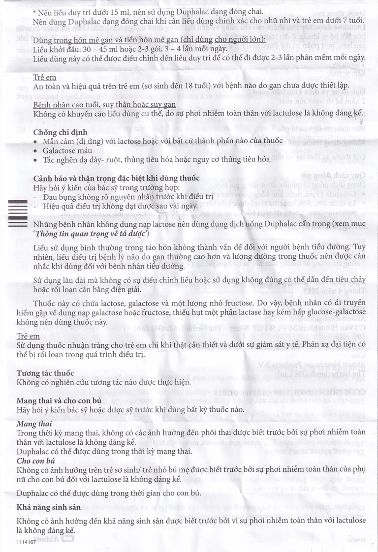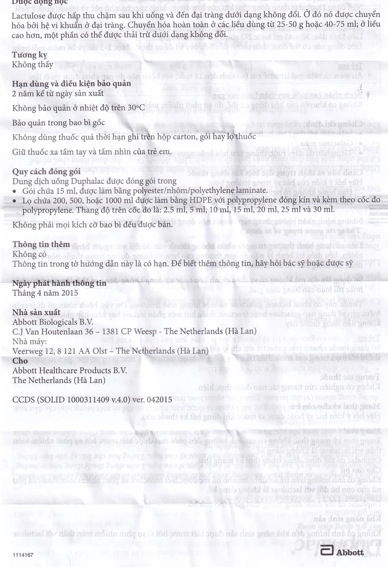 Duphalac Syrup Abbott 200Ml của công ty Abbott Biologicals B.V., thành phần chính chứa lactulose, là thuốc dùng để trị táo bón, bệnh lý não gan.Duphalac Syrup Abbott 200Ml được bào chế dưới dạng dung dịch uống, chất lỏng sền sệt, trong suốt, dung dịch không màu đến nâu vàng, dùng đường uống, hộp 20 gói x 15 mL, chai 200 mL, 500 mL hoặc 1000 mL.