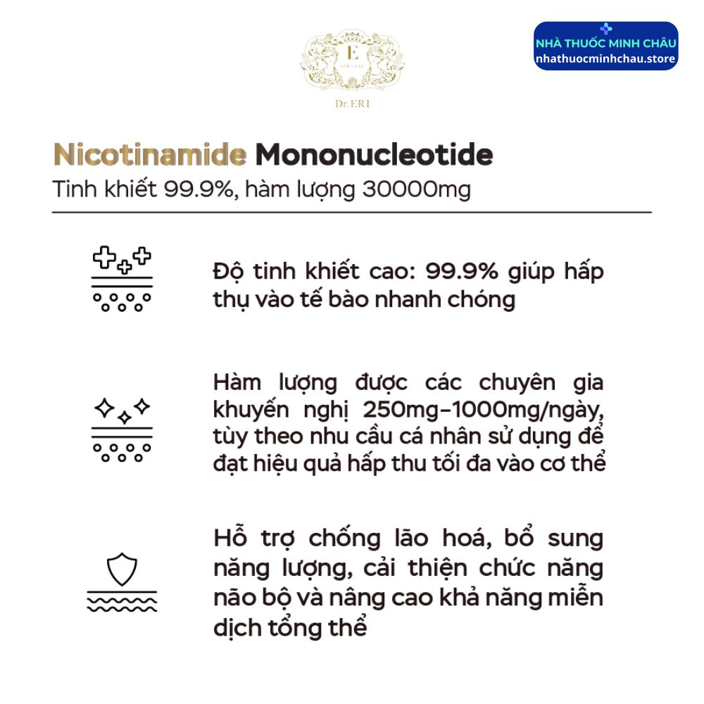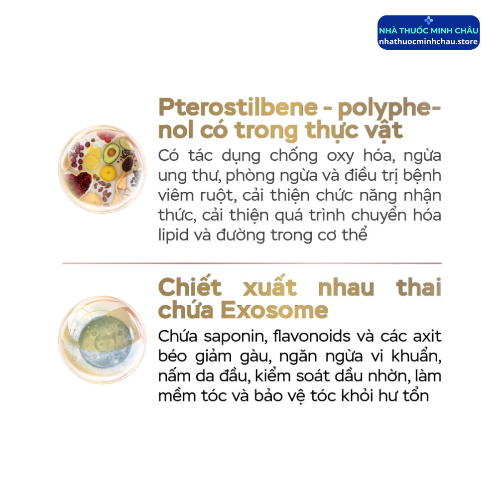 • Thành phần: NMN (1000mg/ngày), Pterostilbene (50mg/ngày), Chiết xuất nhau thai chứa Exosome.
