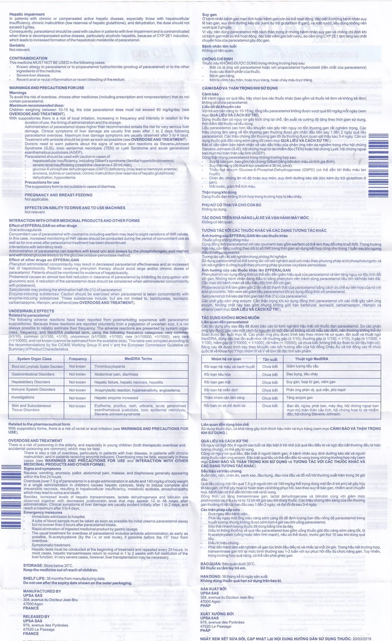 Tuổi thích hợp tương ứng với cân nặng được trình bày bên đưới chỉ để tham khảo. Để tránh nguy cơ bị quá liều, kiểm tra các thuốc uống cùng lúc (cả thuốc kê đơn và không kê đơn) phải không chứa paracetamol. Quá liều do vô ý có thể dẫn đến tổn thương gan nặng và gây tử vong.