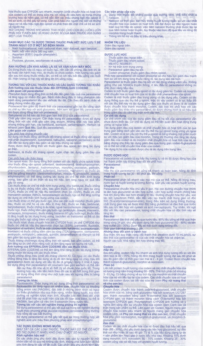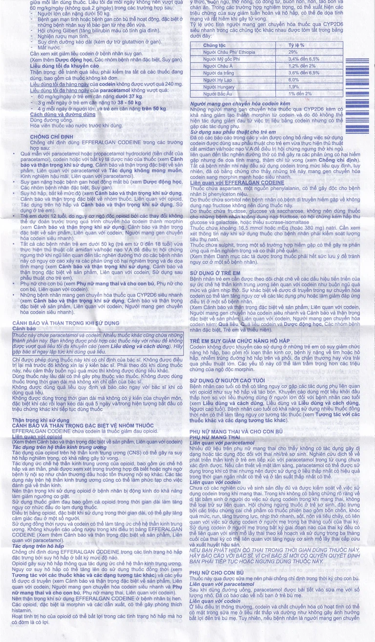 (Xem: Cảnh báo và thận trọng đặc biệt về sản phẩm, liên quan với codein, người chuyển hóa cực nhanh codein và cảnh báo và thận trọng đặc biệt về sản phẩm, liên quan với codein, người chuyển hóa kém codein, quá liều, quá liều codein và dược động học, các nhóm bệnh nhân đặc biệt, trẻ em và thiếu niên).