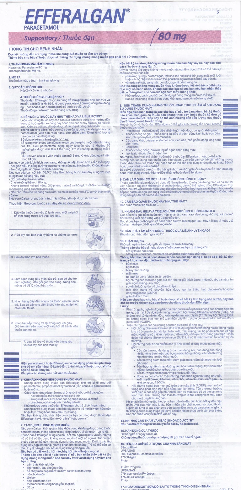 Thuốc hạ sốt nhét hậu môn Efferalgan 80mg dùng đường trực tràng.